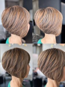 後頭部の丸みと立体感を美しく見せるために、後ろの段の位置を少し高めに設定し、全体にレイヤーを入れたデザインです。