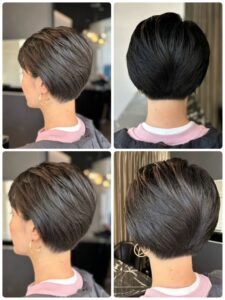 後ろのデザインは前下がりにカットして、後頭部にボリュームが出て骨格修正できるようにしています。